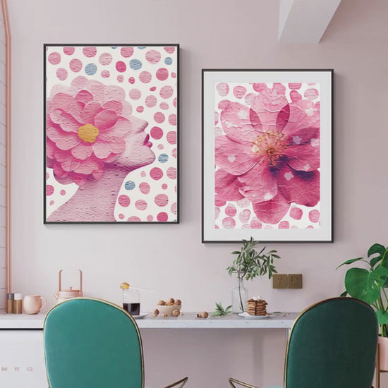 This floral wall art print features a vibrant arrangement of pink and white flowers, designed to complement the Side Profile with Afro print. Its bold yet harmonious composition mirrors the energy and palette of the companion piece, creating visual balance when displayed together or standing beautifully on its own.