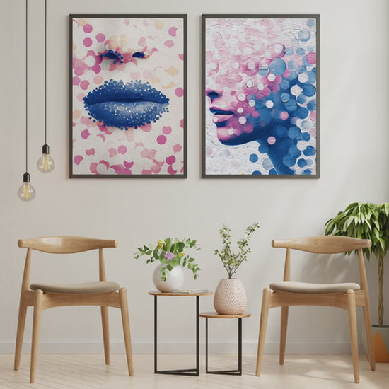 This modern wall art print features the lower part of a gender-neutral side profile from the nose down, composed entirely of dynamic pink and royal blue dots. Its abstract, minimalist design creates texture, movement, and a contemporary focal point for any room. The piece harmonizes beautifully with complementary prints, making it perfect for gallery wall arrangements or standalone display.